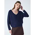 Losvallende donkerblauwe geborstelde cashmere trui met lange mouwen en een v-hals.